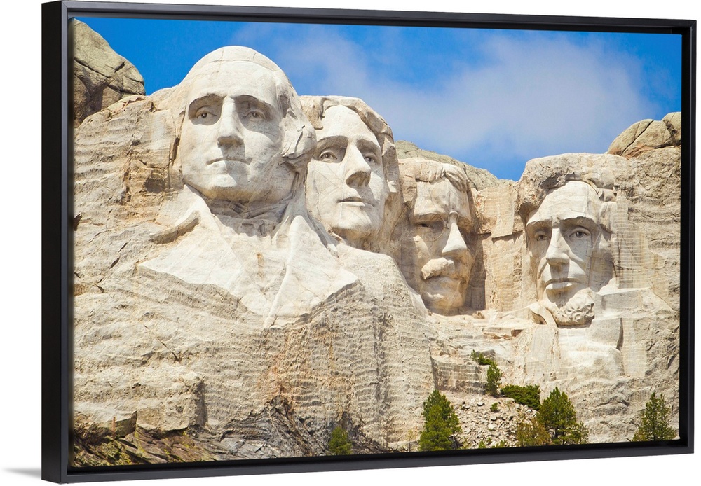 <p>Low angle view of the sculpted images of American presidents Washington, Jefferson, Theodore Roosevelt, and Lincoln, at Mount Rushmore.</p>