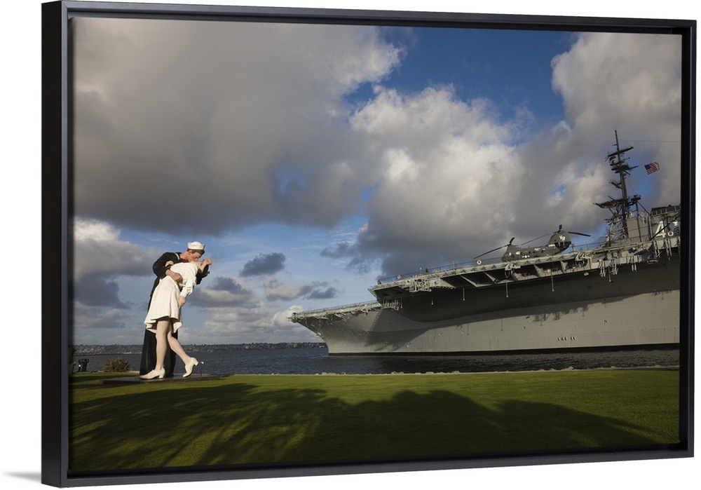 <p>USA, California, San Diego, sculpture Unconditional Surrender by J. Seward Johnson alongside USS Midway aircraft carrier, San Diego waterfront</p>