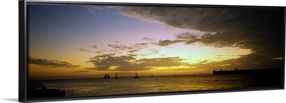 <p>Panoramic photograph of ocean with sailboats in the distance under a cloudy sky at dusk.</p>