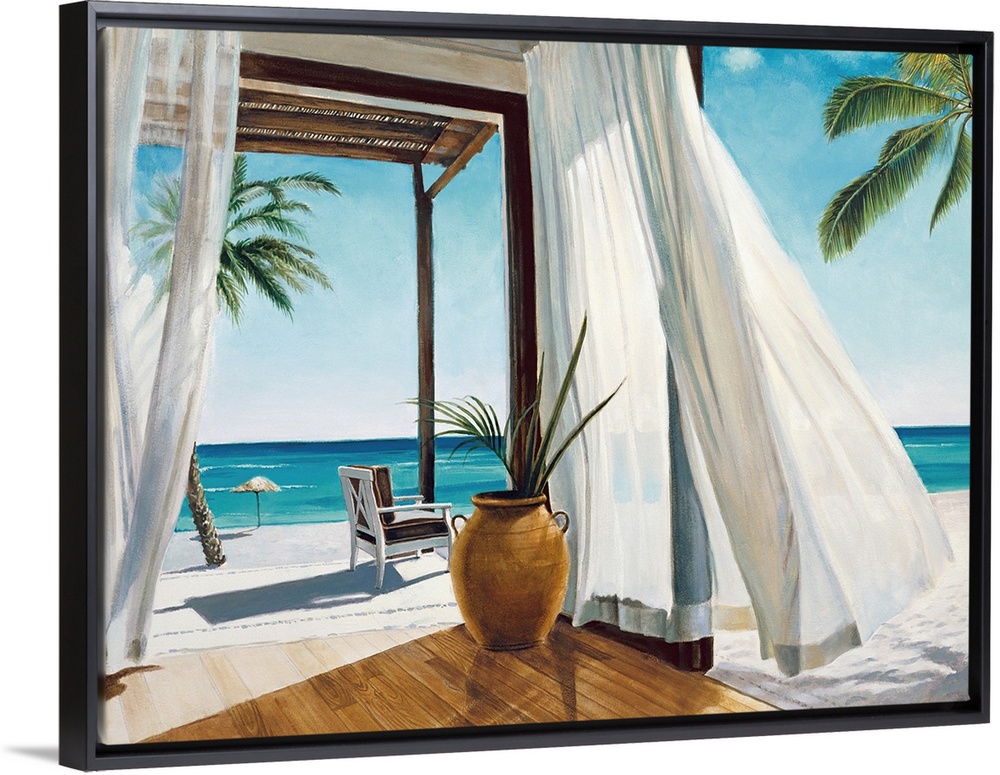 <p>Contemporary painting of a relaxing veranda on a white sand beach with beautiful blue water in the distance.</p>