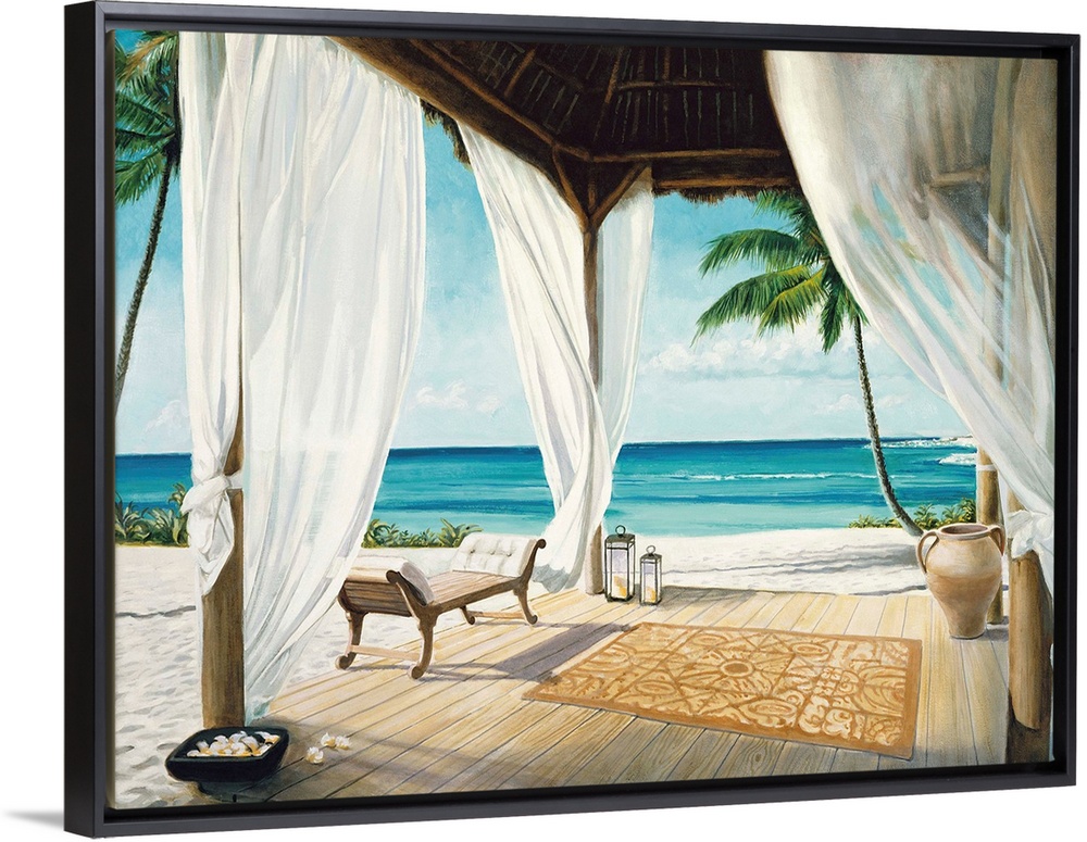<p>Contemporary painting of a relaxing beach setting with a veranda on a beautiful day.</p>