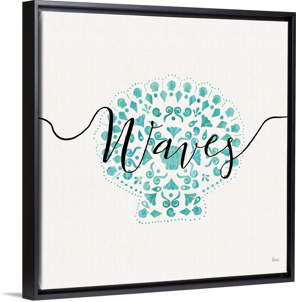 <p>Square watercolor painting of a seashell in blue-green hues with "Waves" written across in black script on a white background.</p>