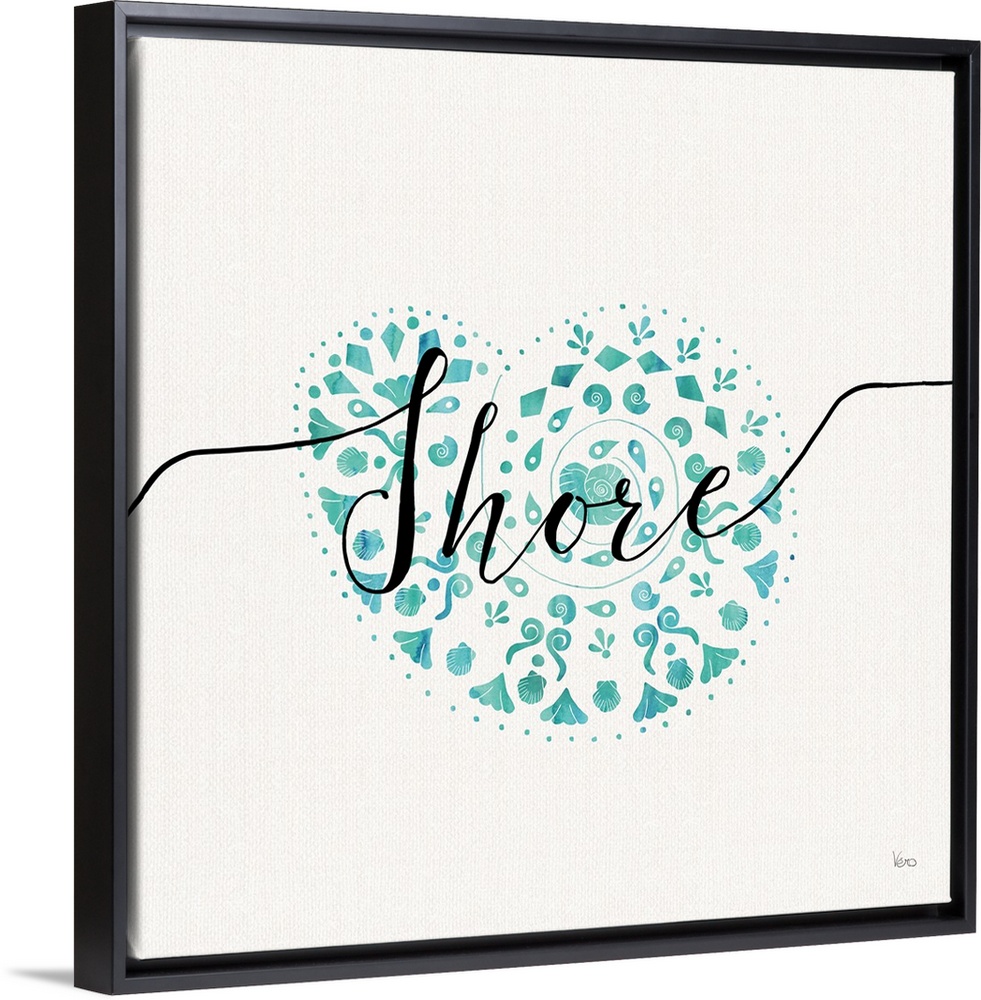 <p>Square watercolor painting of a seashell in blue-green hues with "Shore" written across in black script on a white background.</p>