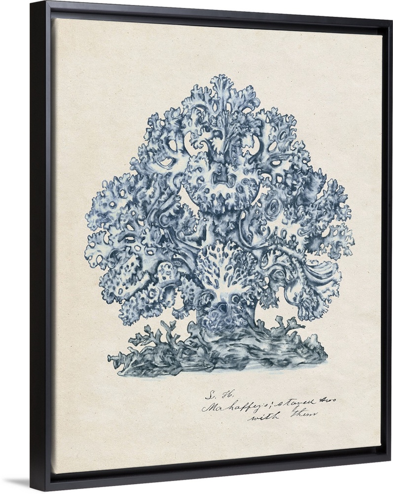 <p>A watercolor illustration of details of coral in blue against a beige backdrop.</p>