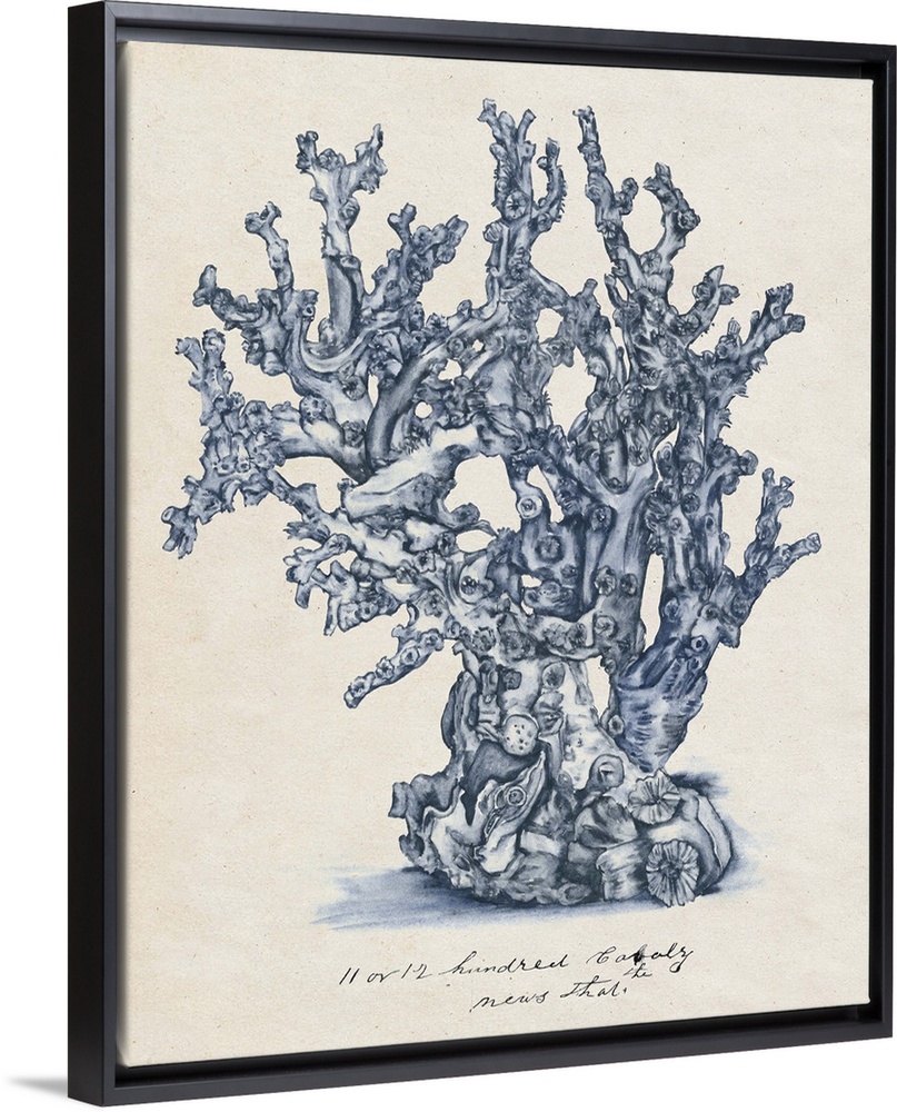 <p>A watercolor illustration of details of coral in blue against a beige backdrop.</p>