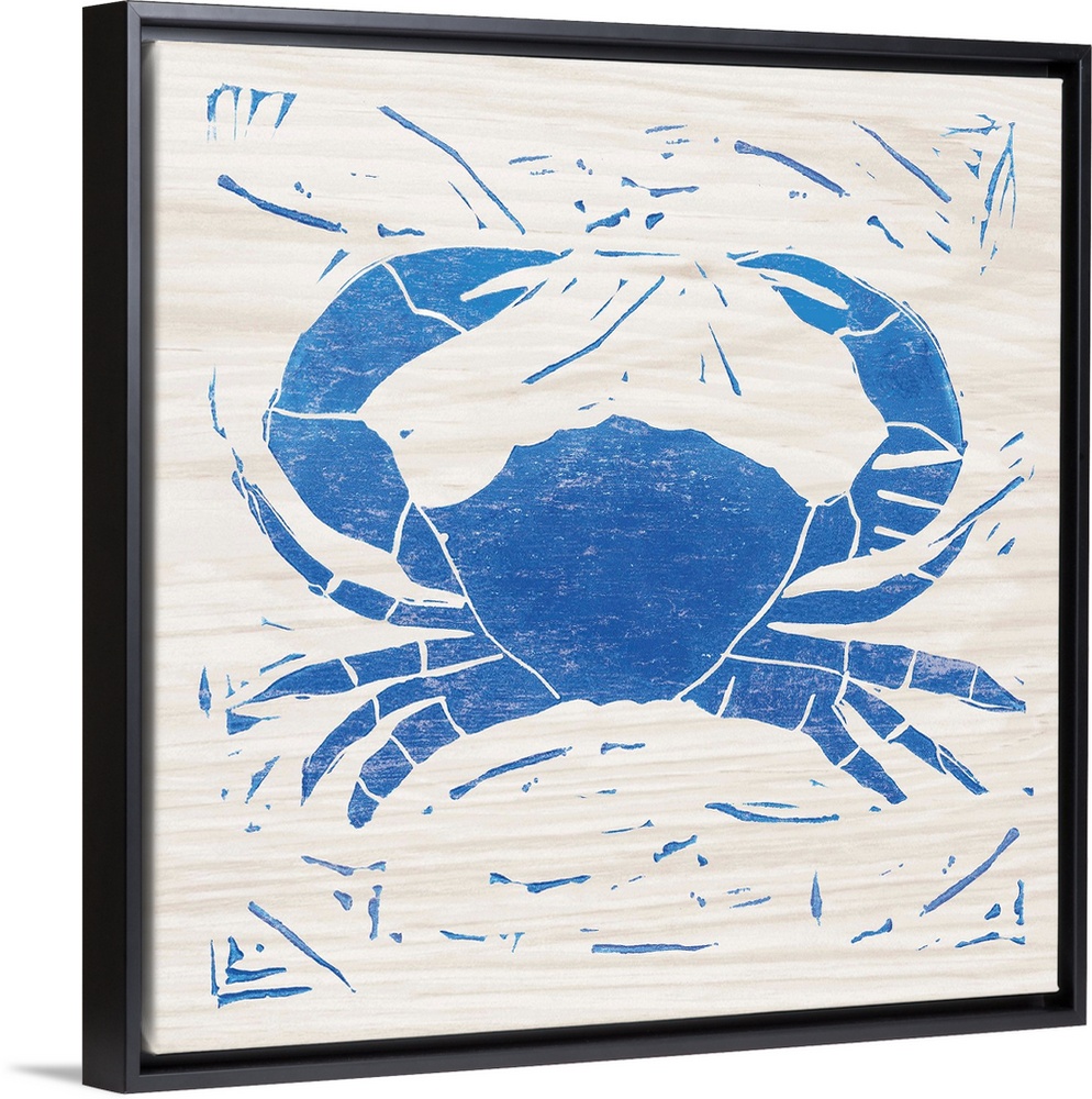 <p>Blue woodcut-style crab print on wood.</p>