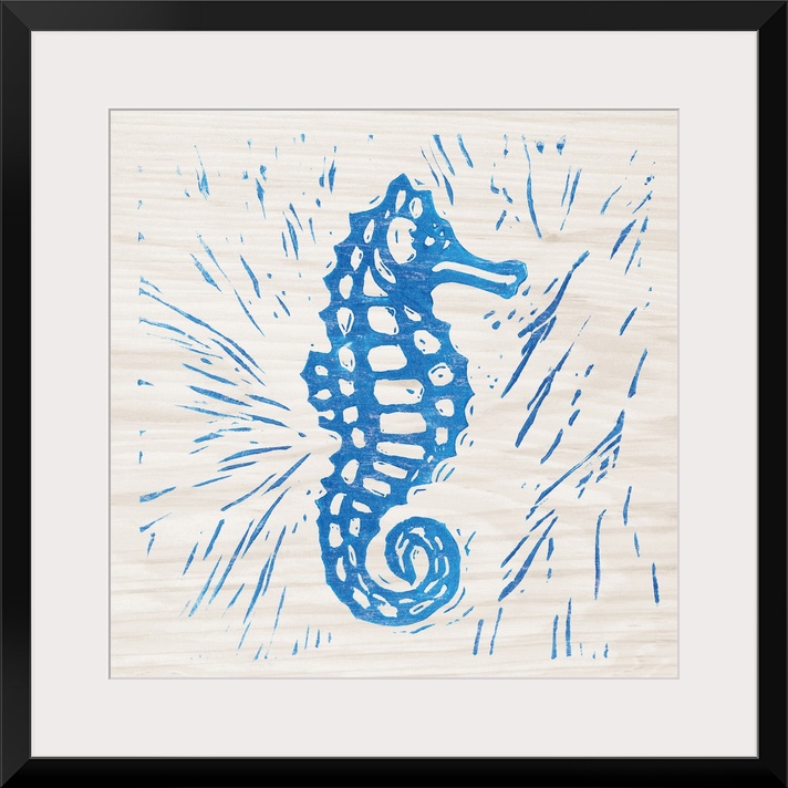<p>Blue woodcut-style seahorse print on wood.</p>
