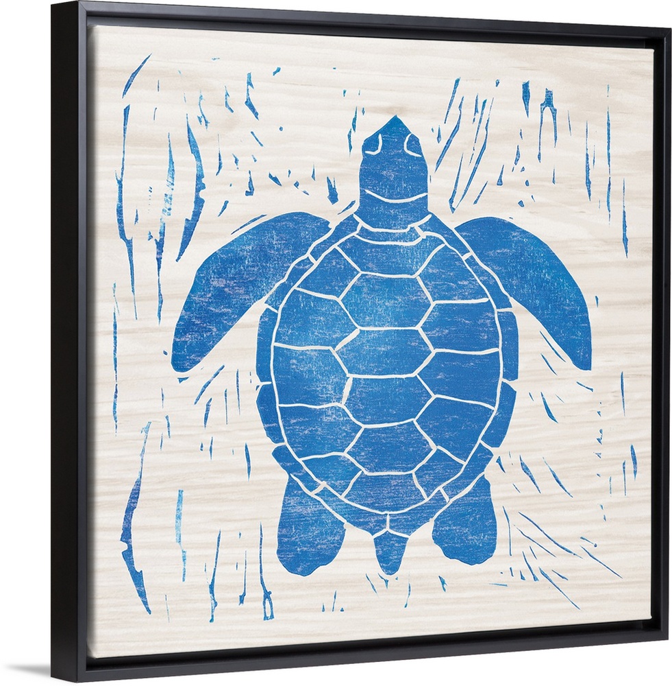 <p>Blue woodcut-style sea turtle print on wood.</p>