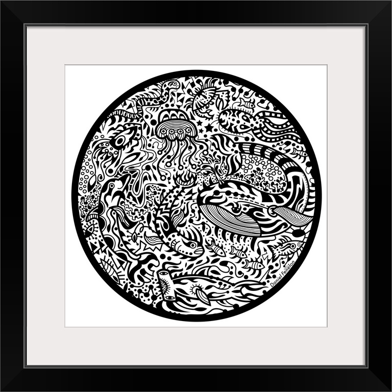 <p>Contemporary mural artwork of marine life and other abstract figures in a confusion of monochromatic patterns.</p>