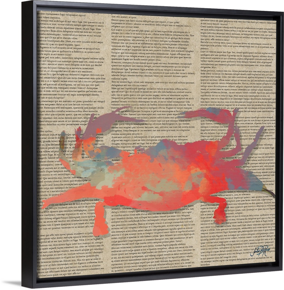 <p>Painting of a red abstract crab on vintage newspaper.</p>