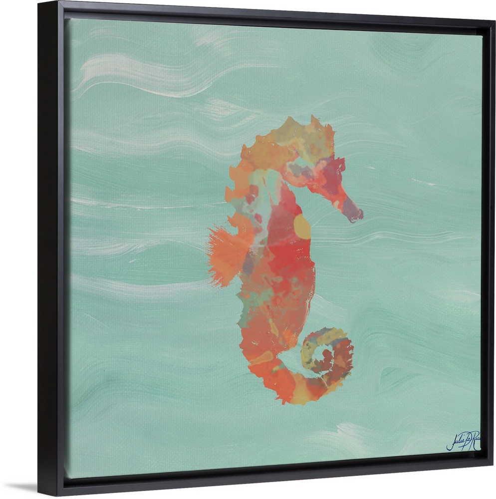 <p>Painting of a red abstract seahorse on a teal background.</p>