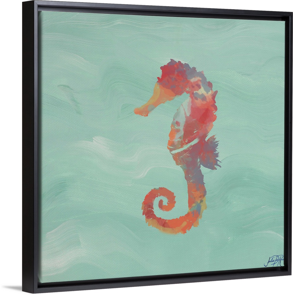 <p>Painting of a red abstract seahorse on a teal background.</p>