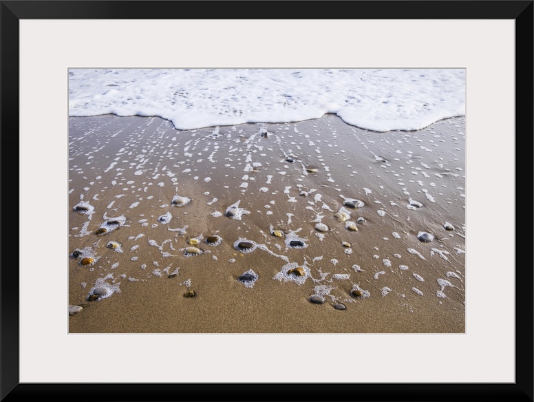 <p>Sea foam trails from beached pebbles as the tide is pulled out, south shields, Tyne and Wear, England.</p>