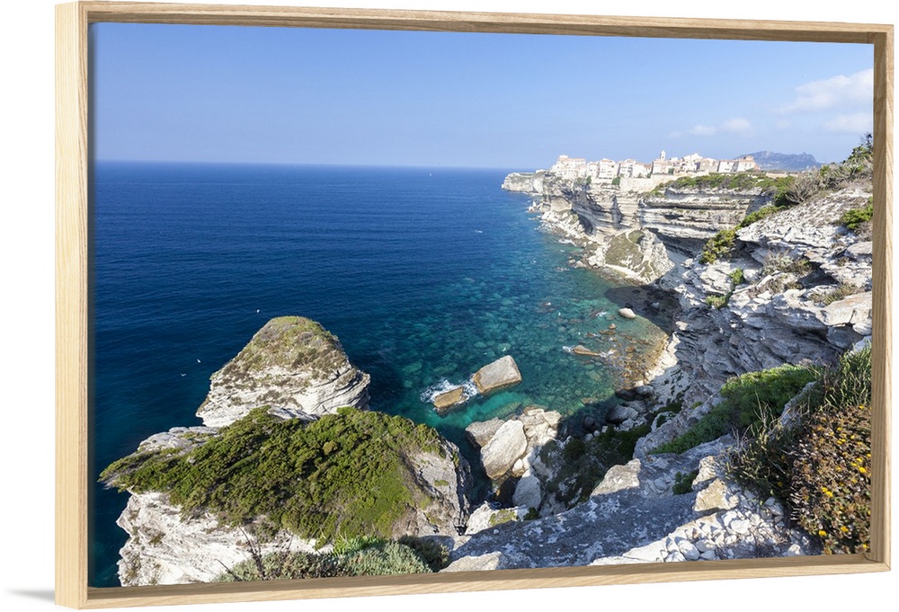 <p>Turquoise sea frames the medieval old town and fortress perched on top of cliffs, Bonifacio, Corsica, France</p>