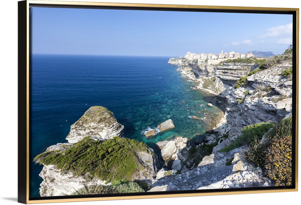 <p>Turquoise sea frames the medieval old town and fortress perched on top of cliffs, Bonifacio, Corsica, France</p>
