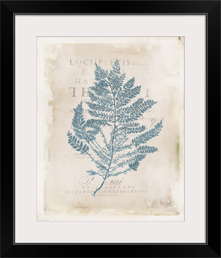 <p>Vintage style illustration of blue seaweed with faded text in the background.</p>