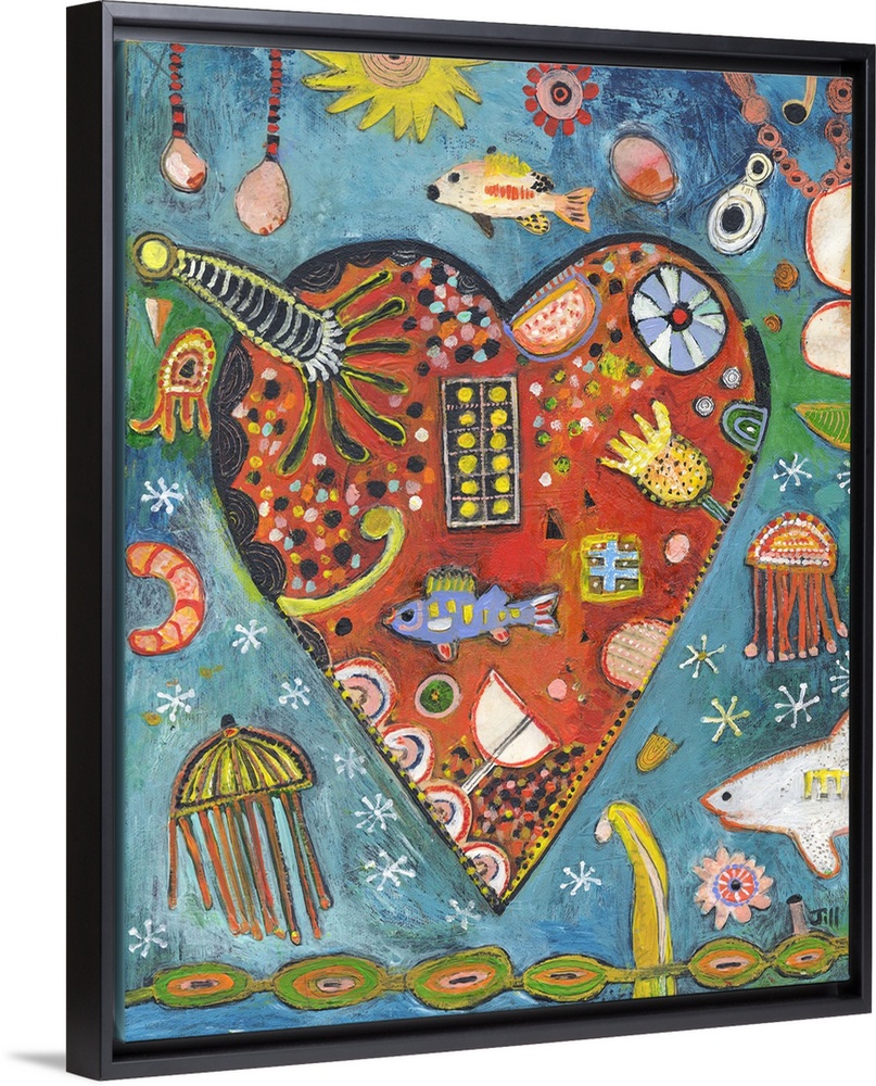 <p>Lighthearted contemporary painting of a heart with a collage of marine life inside.</p>