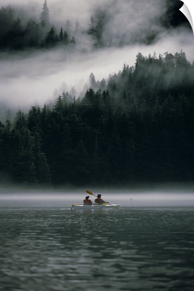 <p>Couple sea kayaking in red bluff bay w/mist rolling off Baranof Isl Chatham strait southeast Alaska.</p>