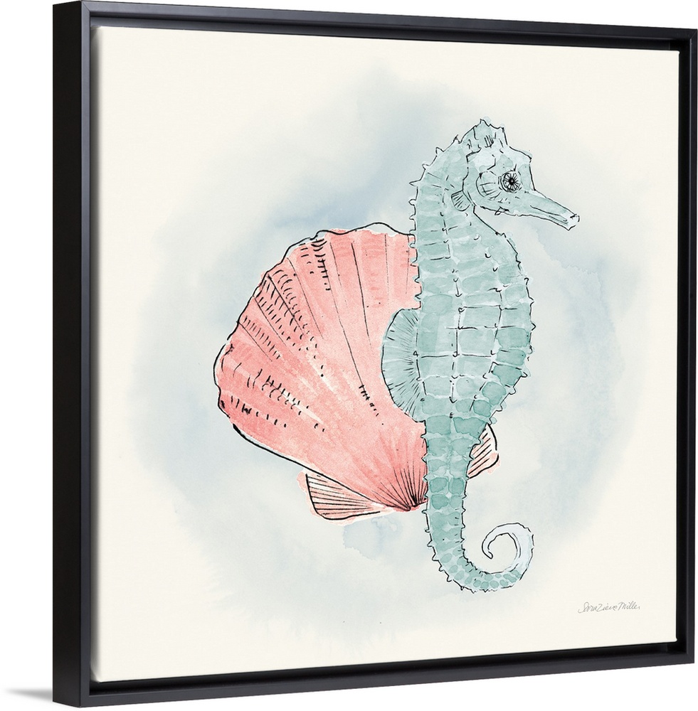 <p>Decorative artwork of an illustrated seahorse with a seashell.</p>