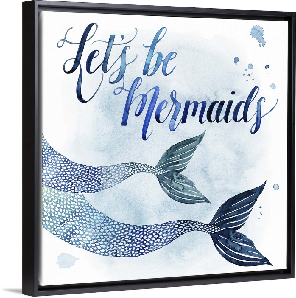 <p>Square beach themed decor with painted mermaid fins and the phrase "Let's Be Mermaids" all in shades of blue.</p>