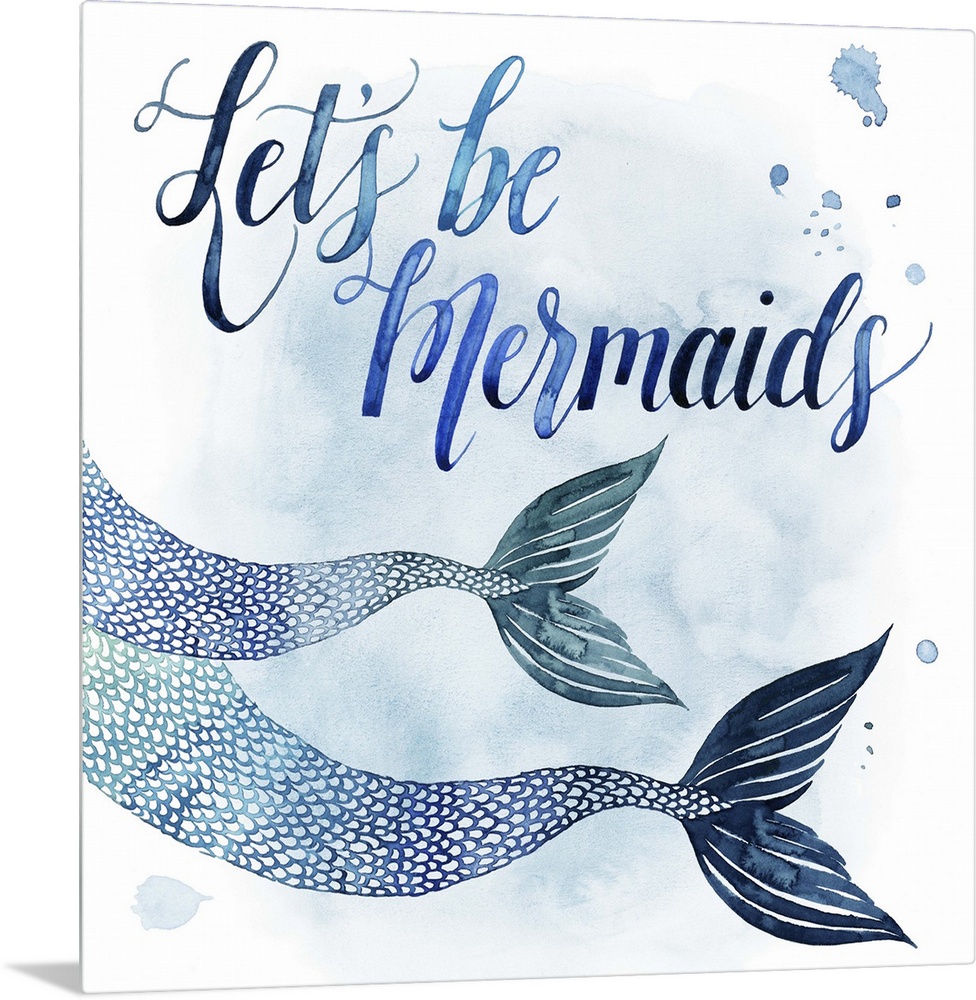 <p>Square beach themed decor with painted mermaid fins and the phrase "Let's Be Mermaids" all in shades of blue.</p>