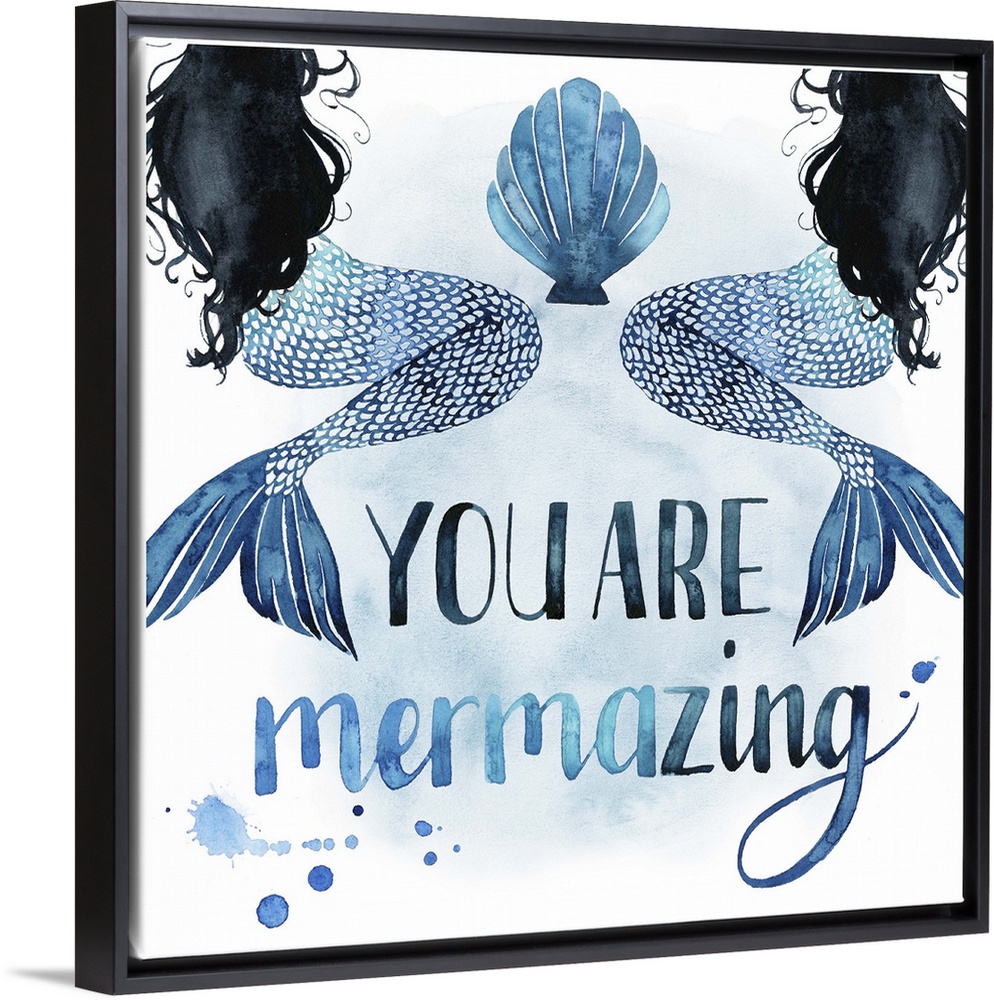 <p>Square beach themed decor with painted mermaids and the phrase "You Are Mermazing" all in shades of blue.</p>
