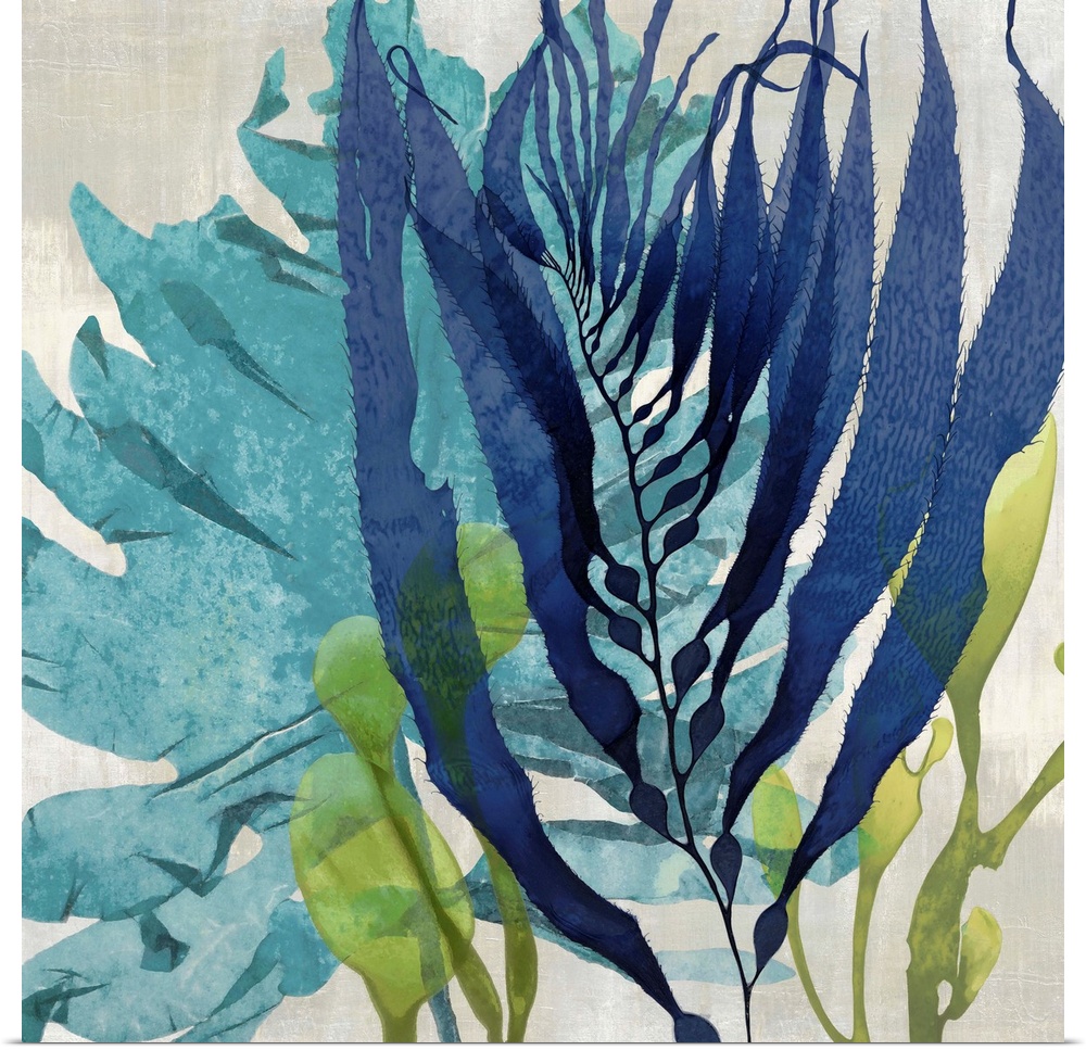 <p>Square decor with sea plants in shades of blue and green on a neutral colored background.</p>