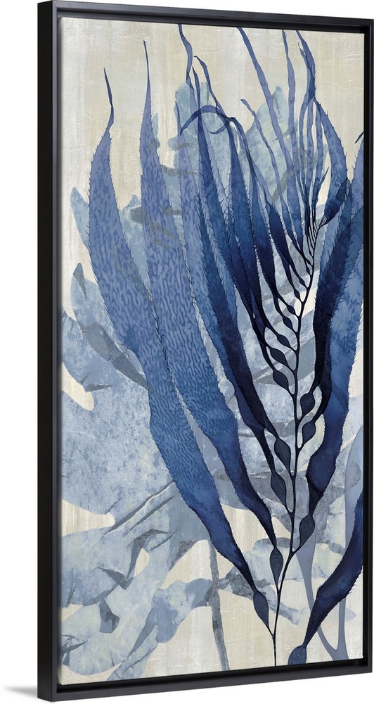 <p>Beach themed decor with indigo sea vegetation on a gray and tan background.</p>