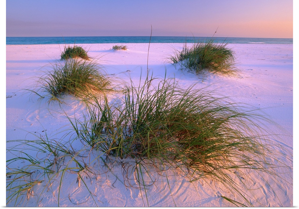 <p>Small clumps of sea grass grow in the fine white sand of this beach photograph ready for hanging on a beach cottage wall.</p>