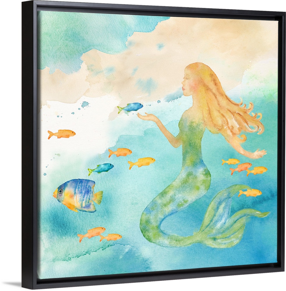 <p>A watercolor image of a mermaid among colorful fish.</p>