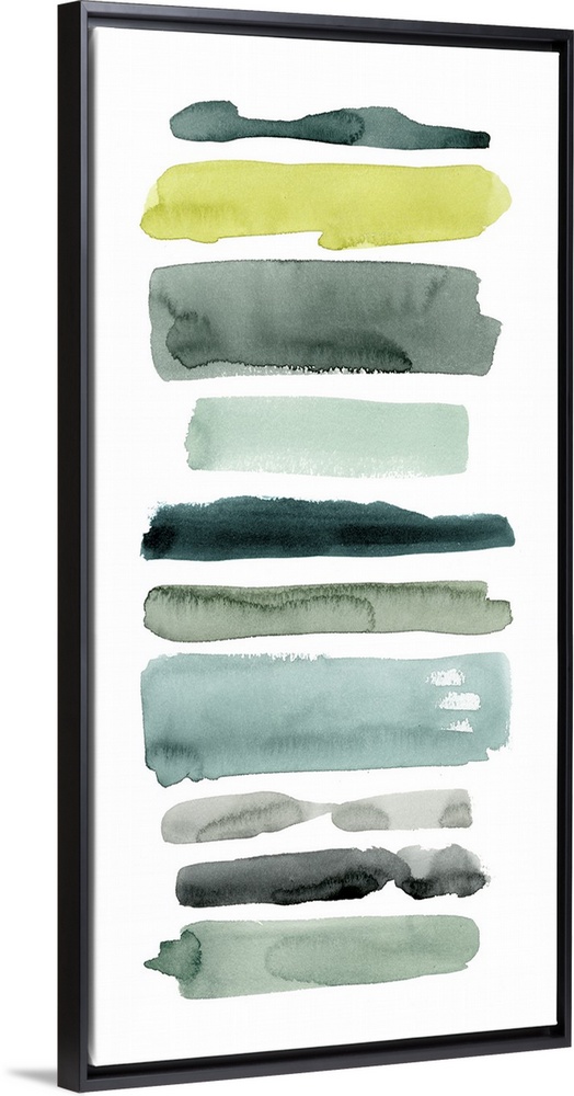 <p>Large panel abstract watercolor with horizontal brushstrokes of different thicknesses going up the canvas in the colors of the sea.</p>