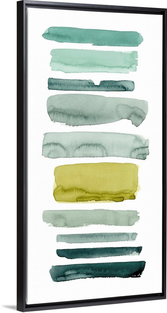 <p>Large panel abstract watercolor with horizontal brushstrokes of different thicknesses going up the canvas in the colors of the sea.</p>