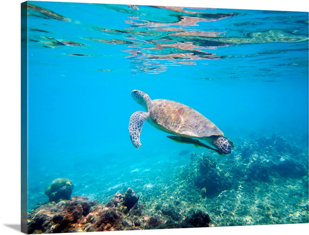 <p>Underwater image of a sea turtle and remora swimming together in clear blue tropical water, Tokashiki Island of Kerama Islands, Okinawa, Japan.</p>