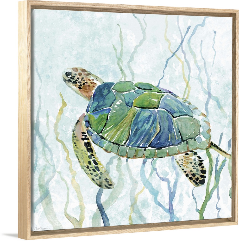 <p>Square watercolor painting of a sea turtle swimming amongst seaweed in shades of blue and green.</p>