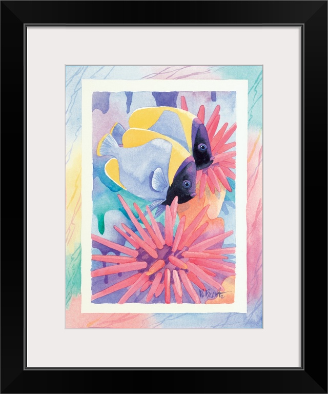 <p>Watercolor painting of two fish swimming near sea urchins, done in pastel colors.</p>