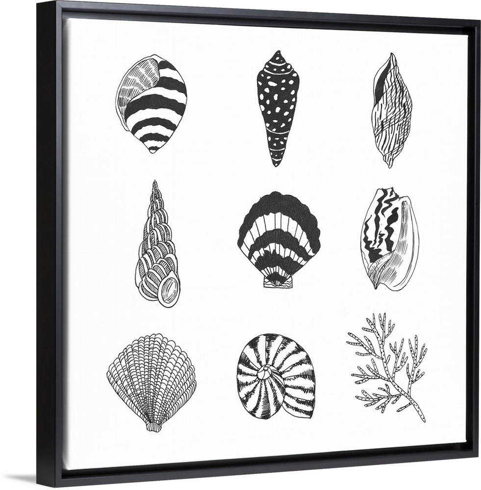 <p>Black and white illustrations of a variety of shells.</p>