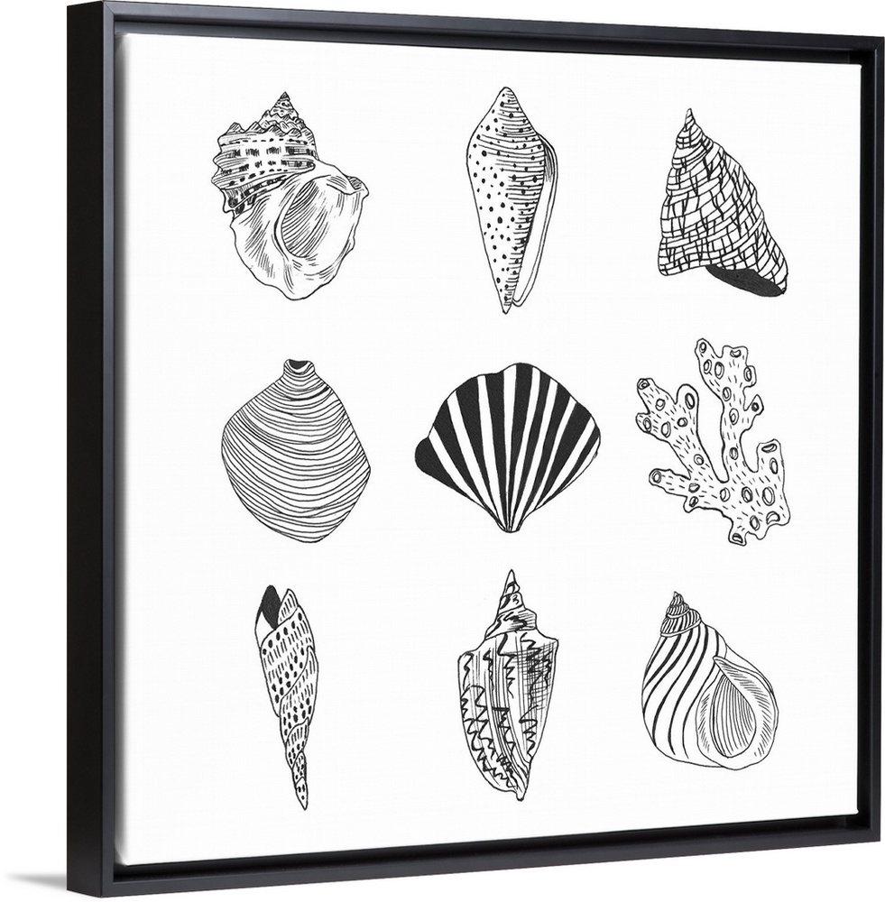 <p>Black and white illustrations of a variety of shells.</p>