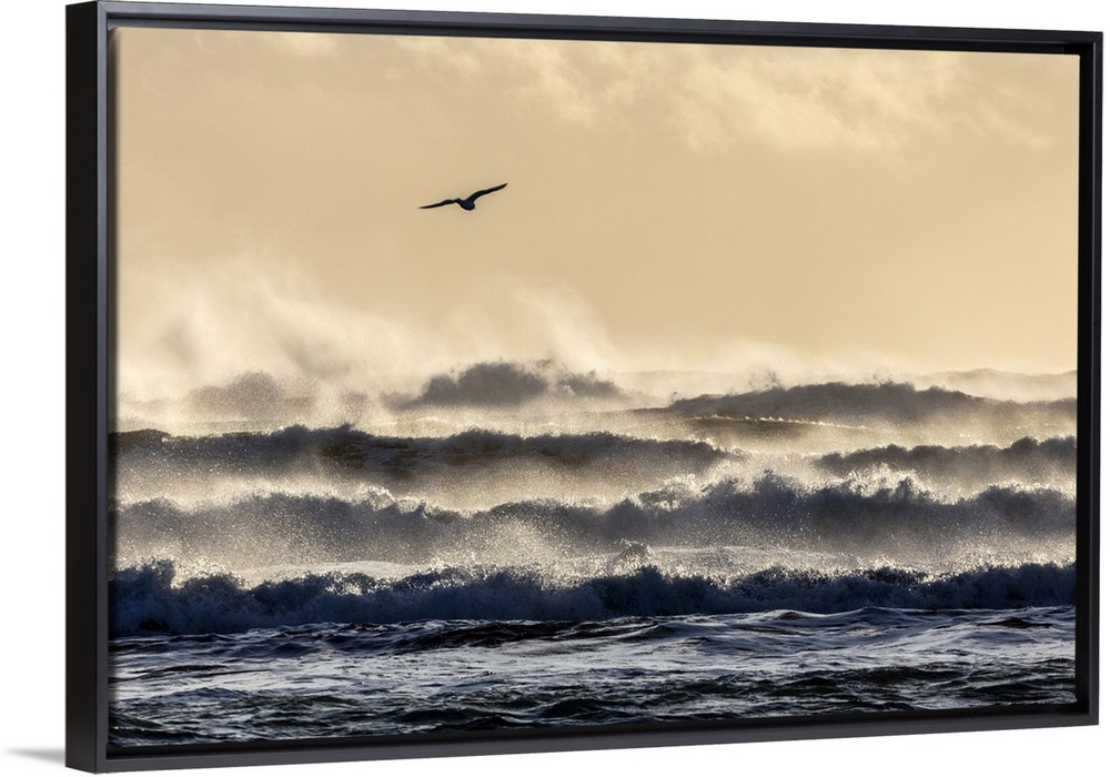 <p>Seabird flying in front of crashing waves from the black sand beach (Diamond Beach) near Jokulsarlon Glacier Lagoon, South Iceland.</p>