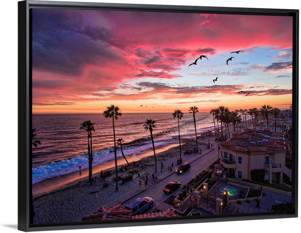 <p>Colorful sunset with seabirds passing over the coastline in Oceanside, California, USA.</p>