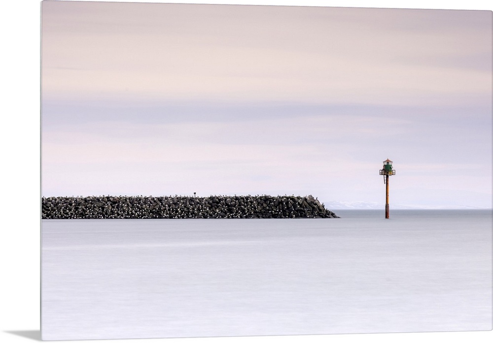 <p>Seabirds resting on stone breakwater, near Rif, Snaefellsnes Peninsula, Iceland.</p>