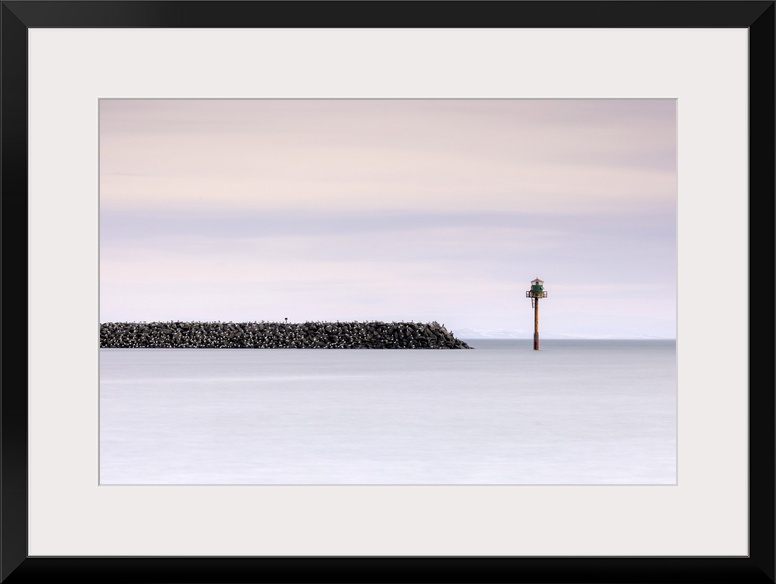 <p>Seabirds resting on stone breakwater, near Rif, Snaefellsnes Peninsula, Iceland.</p>
