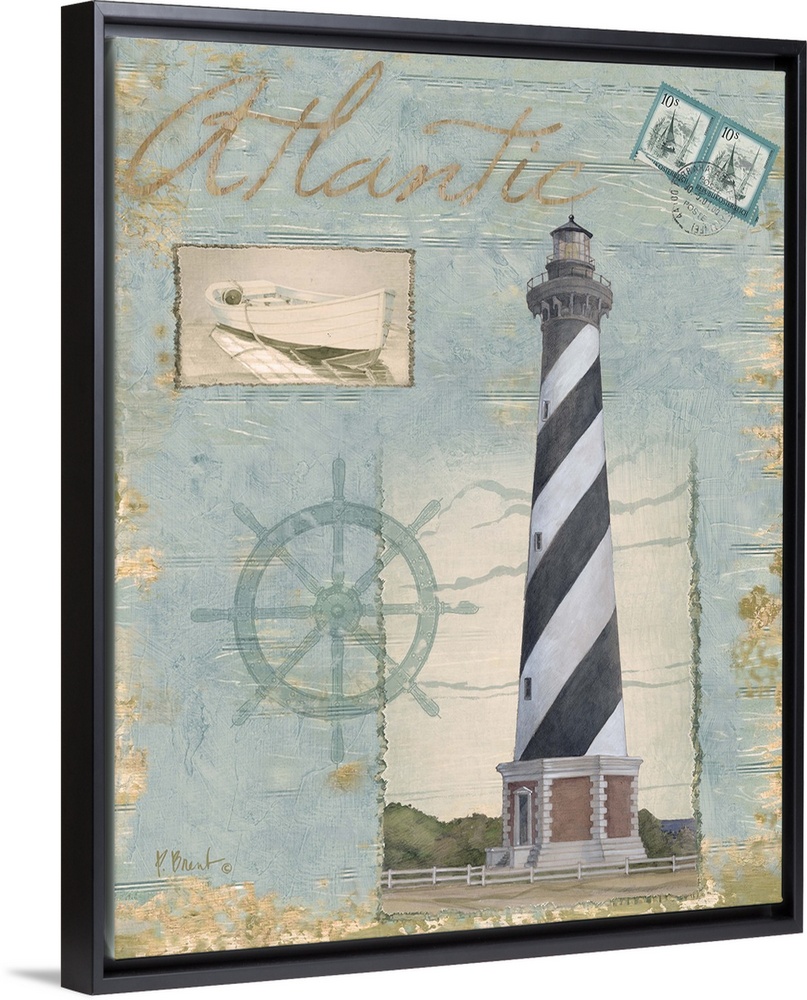 <p>Collage-style artwork featuring a lighthouse, a ship's wheel, and postage stamps on a textured wooden background.</p>