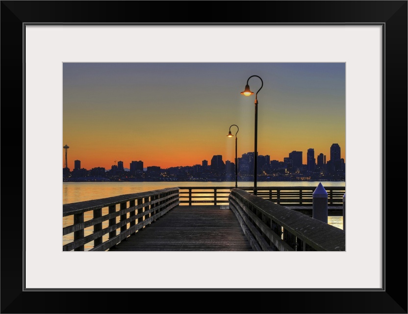 <p>Horizontal photograph on a giant wall hanging looking down the lit Seacrest Park Fishing Pier in Alki Beach as the sun rises over the Seattle skyline in the background.</p>