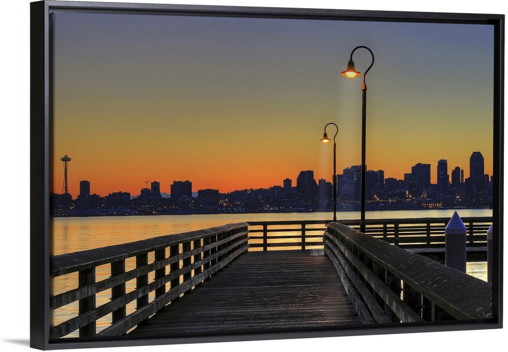 <p>Horizontal photograph on a giant wall hanging looking down the lit Seacrest Park Fishing Pier in Alki Beach as the sun rises over the Seattle skyline in the background.</p>