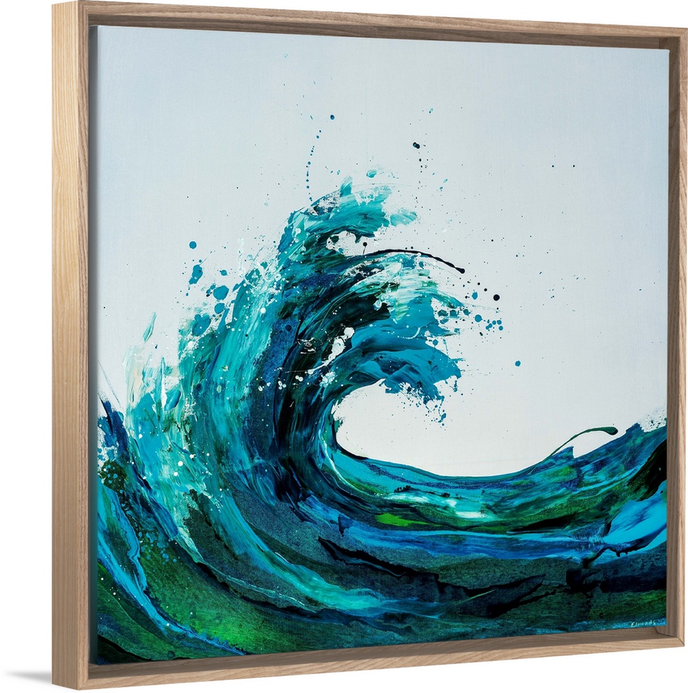 <p>Contemporary square painting of an energetic wave done in various shades of blue and green.</p>