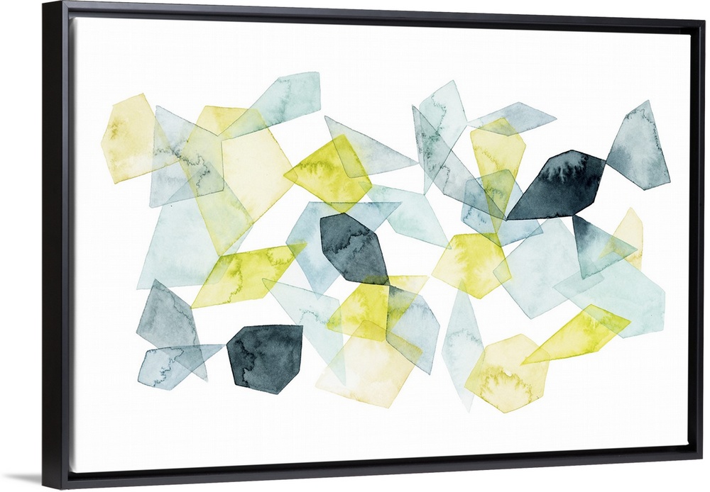 <p>Watercolor geometric shapes in vibrant greens and cool blues dominate this white background landscape in this contemporary artwork.</p>