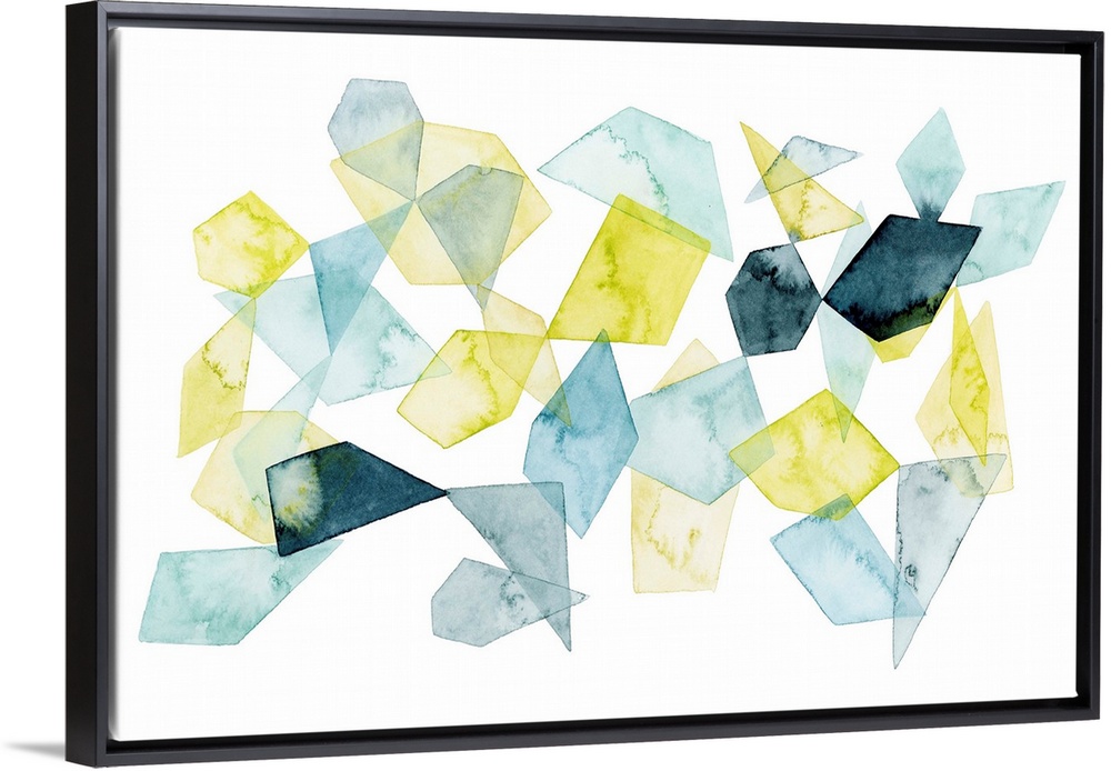 <p>Watercolor geometric shapes in vibrant greens and cool blues dominate this white background landscape in this contemporary artwork.</p>