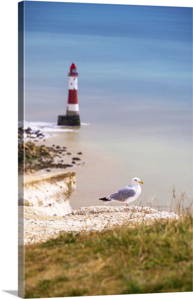 <p>Seagull, Beachy Head chalk cliffs, with Beachy Head Lighthouse in background, South Downs National Park, East Sussex, England, United Kingdom</p>