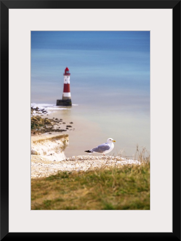 <p>Seagull, Beachy Head chalk cliffs, with Beachy Head Lighthouse in background, South Downs National Park, East Sussex, England, United Kingdom</p>
