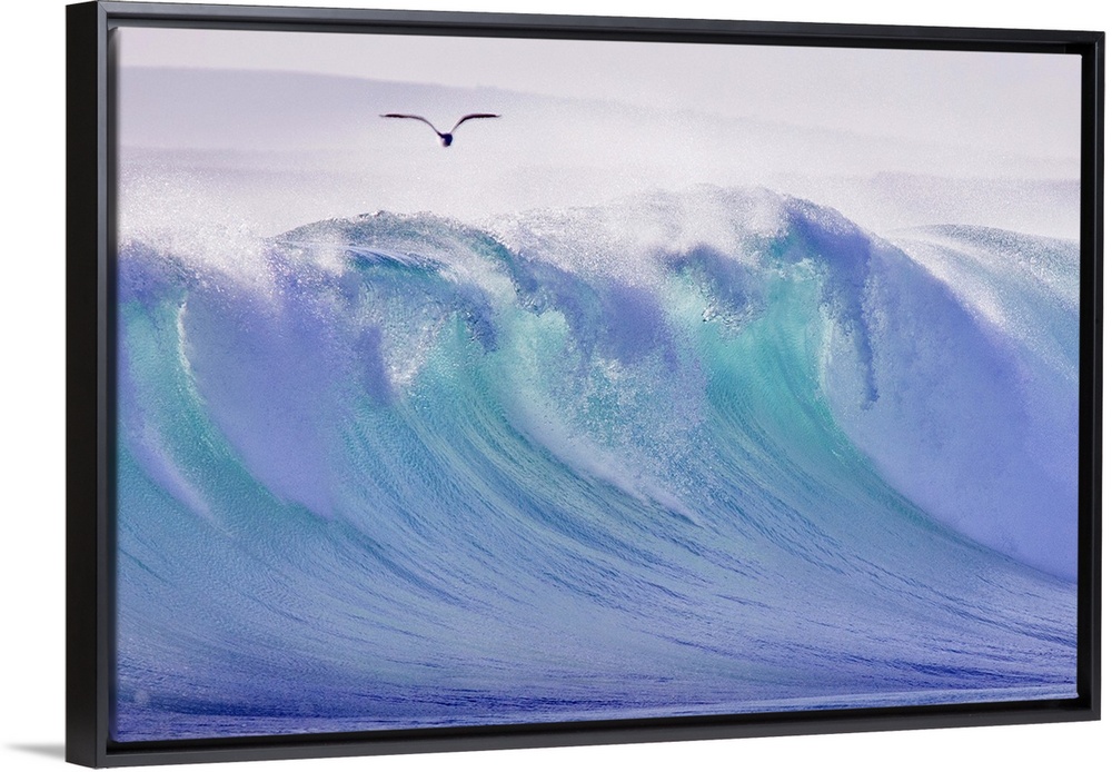 <p>Large photo on canvas of a big wave about to crash with a seagull flying above.</p>